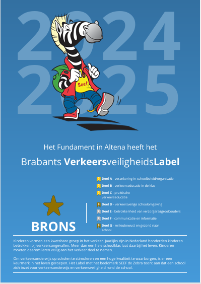 Sinds 2009 zijn wij in het bezit van het BVL veiligheidslabel. Om hieraan te blijven voldoen, krijgt de school elk jaar een herkeuring. We plannen buiten de reguliere verkeerslessen om, activiteiten op en rondom de school zoals de praktische verkeersweken, autoloze schooldag, dode hoekles, fietsencontrole etc. Hiermee hebben we afgelopen jaar ook het label weer in de pocket.